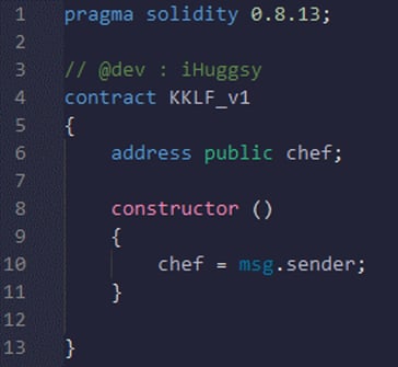 Figure 2 : Code source du premier contrat Nous remarquons que, selon sa déclaration, l’adresse du chef est publique, donc nous devrions y avoir accès. Après quelques dizaines de minutes de recherche et de lecture de la documentation de la bibliothèque « web3 » de python, nous arrivons à la conclusion qu’il est possible de lire cette variable.